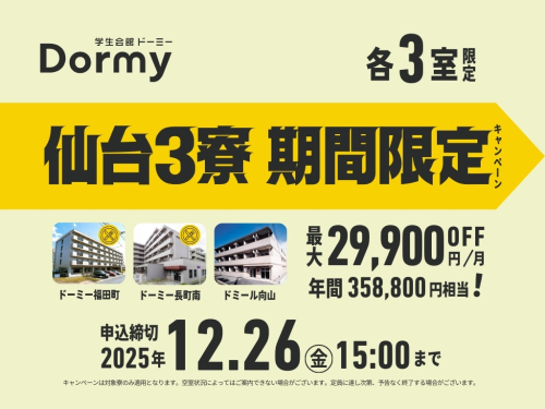 【12月26日まで・先着3室限定】ドーミー福田町・ドーミー長町南・ドミール向山で特別割引! 月額最大29,900円OFF