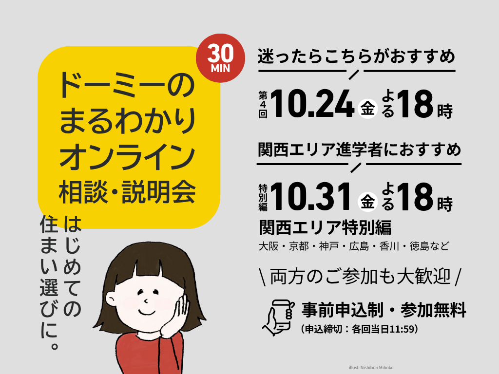 【10/24(金)・10/31(金)開催】 ドーミーのまるわかりオンライン相談・説明会【申込ステップ&関西エリア特別編】 ~お申し込み前の不安や疑問に、スタッフが直接お答えします~