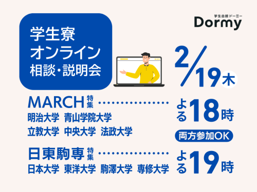 【2/19開催】MARCH・日東駒専向け「学生寮オンライン説明会」|進学・受験予定大学に合わせてご視...