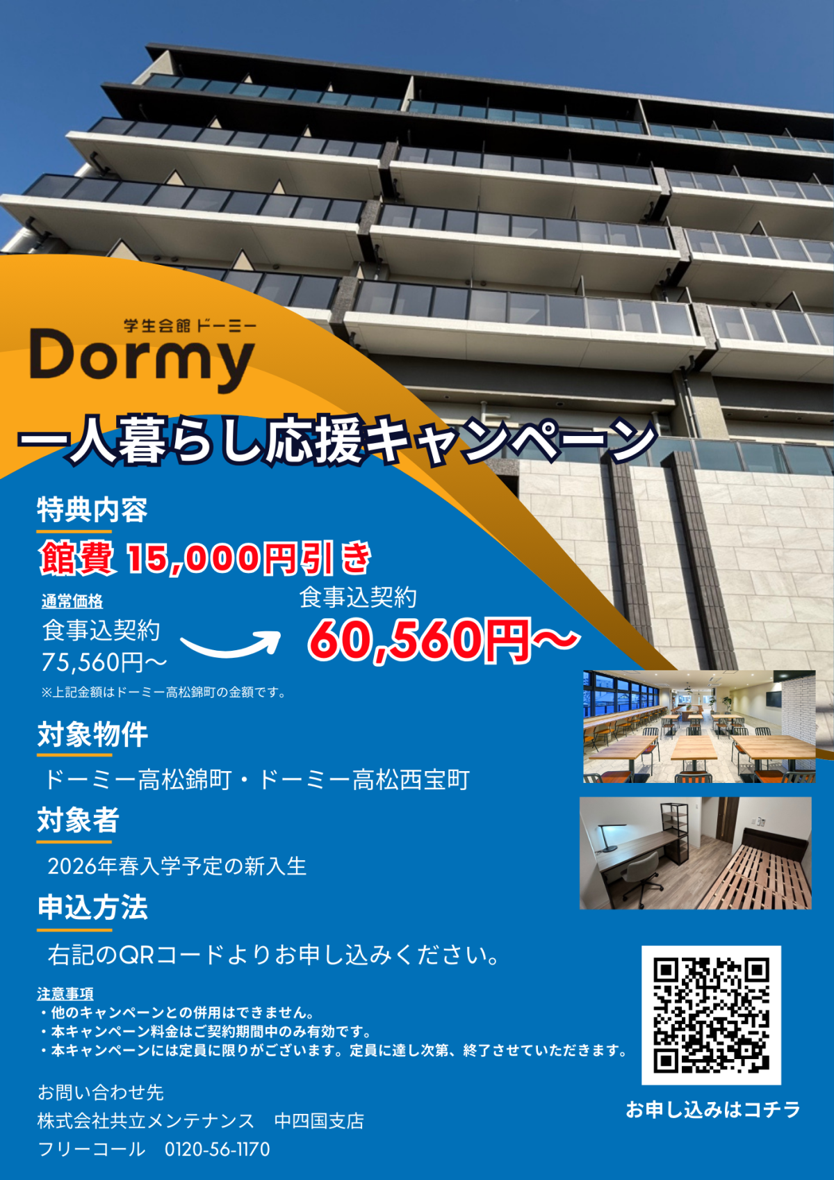 ドーミー高松錦町・高松西宝町の一人暮らし応援キャンペーン!