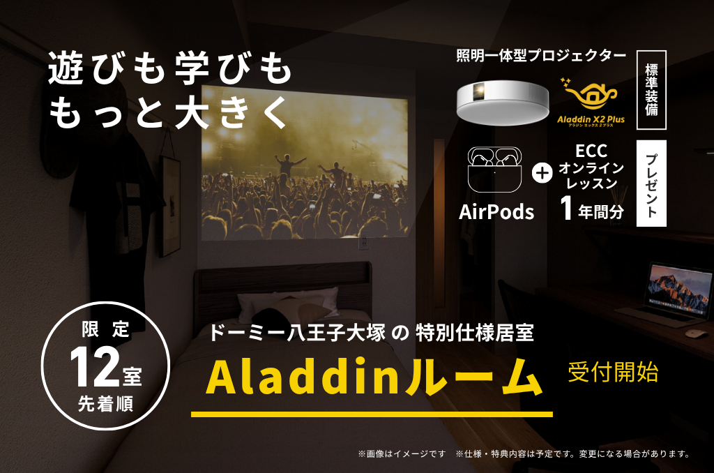 新築オープン記念として「Aladdin X(照明一体型プロジェクター)」付きの特別ルームも限定12室ご用意。勉強の後は大画面で映画を見てリラックスするなど、メリハリのある生活が叶います。もちろん全室Wi-Fi完備なので、オンライン授業や動画視聴もスムーズです