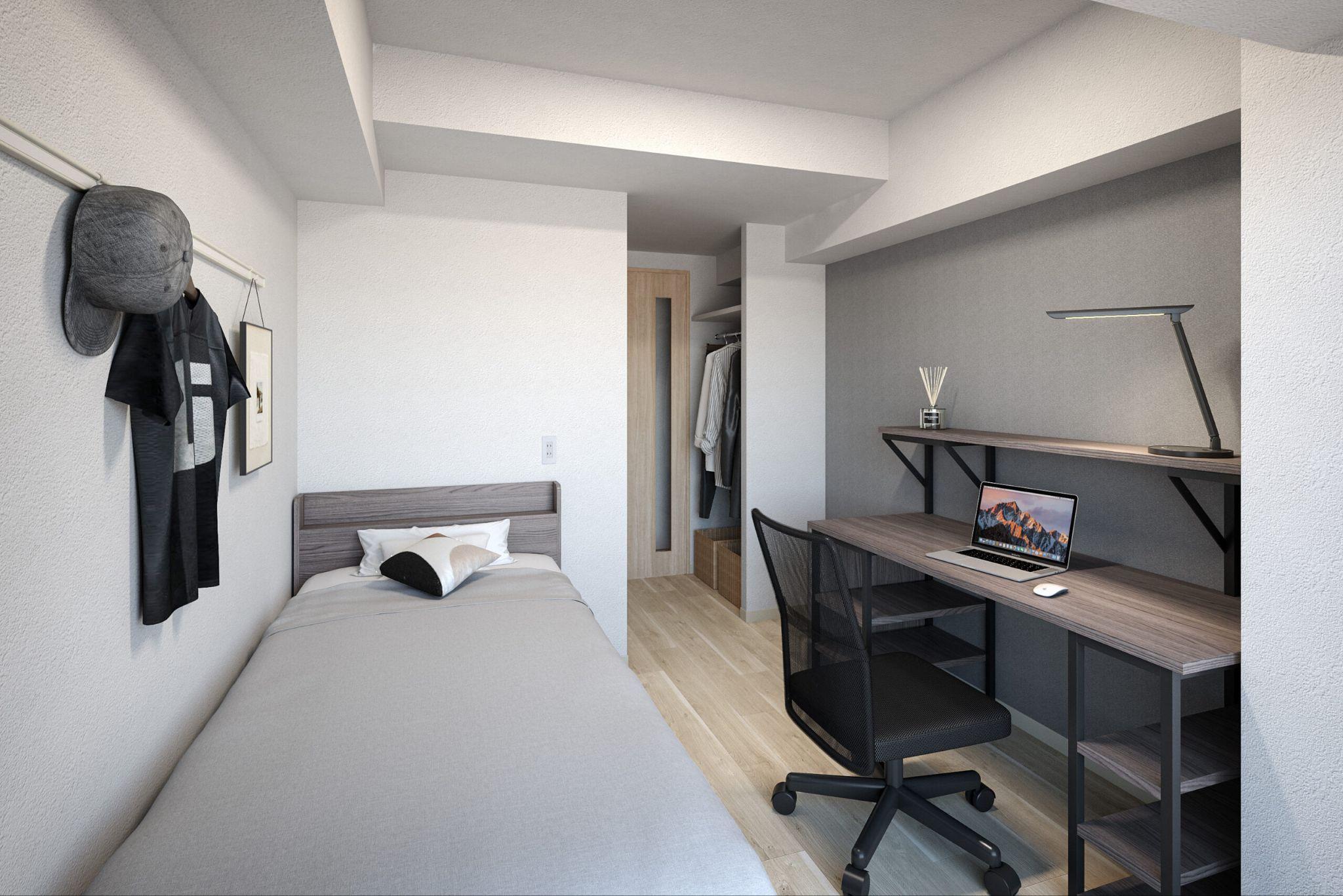 全330室の居室には、ベッド・照明・カーテン・エアコンに加え、2ドア冷蔵庫と洗濯機、机・イス、Wi-Fiまですべて完備。