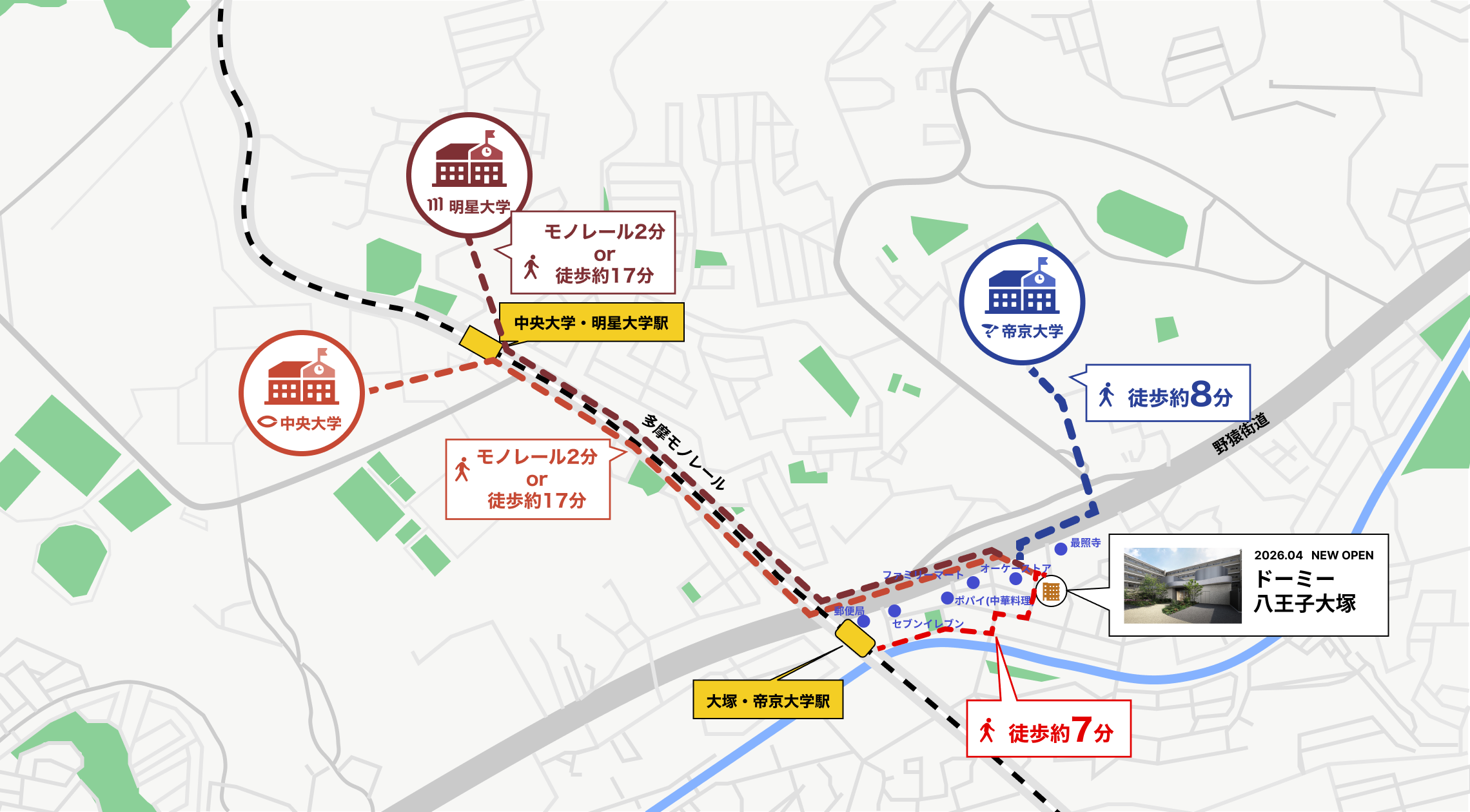 ドーミー八王子大塚から最寄りの「大塚・帝京大学駅」までは徒歩約7分。そこから多摩モノレールに乗れば、中央大学・明星大学駅まではわずか2分(1駅)です。 駅と大学は直結しているため、雨の日でも濡れずに教室へ移動可能。自転車通学のような坂道の負担もなく、サークルや図書館で夜遅くなっても、駅から明るい道を通って帰れるので安心です。