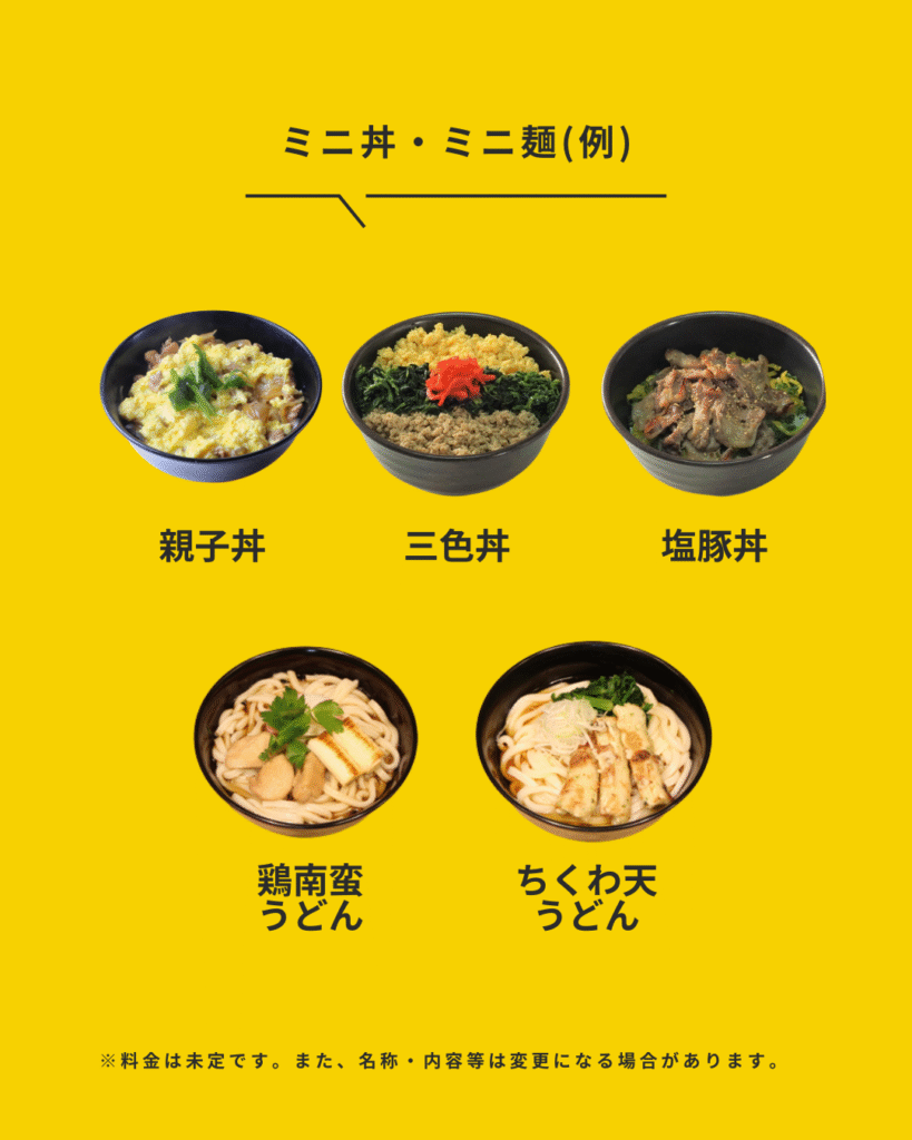 日替わりメニュー(親子丼、塩豚丼、鶏南蛮うどん等)から選べる「ミニ丼・ミニ麺」の補食サービス(有料)をご用意。当日追加注文OKなので、お腹の空き具合に合わせて利用できます。