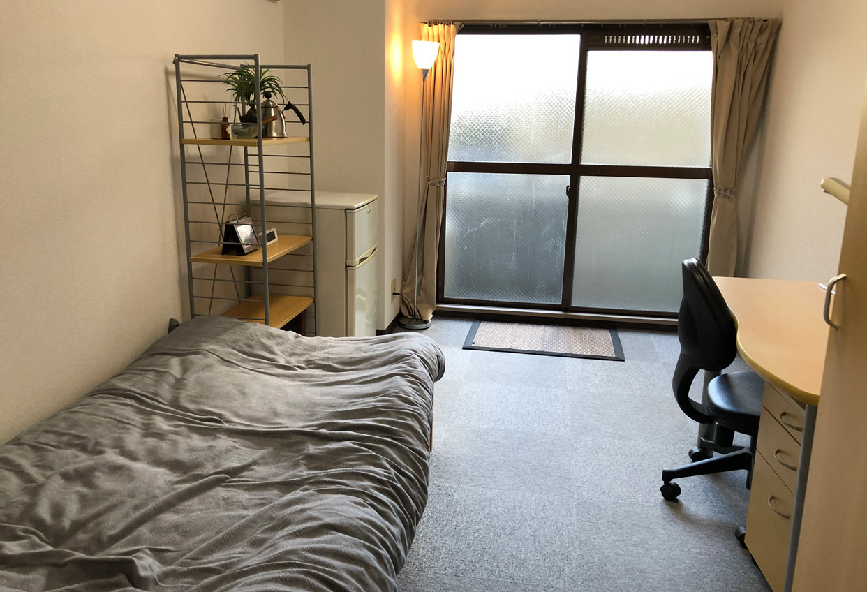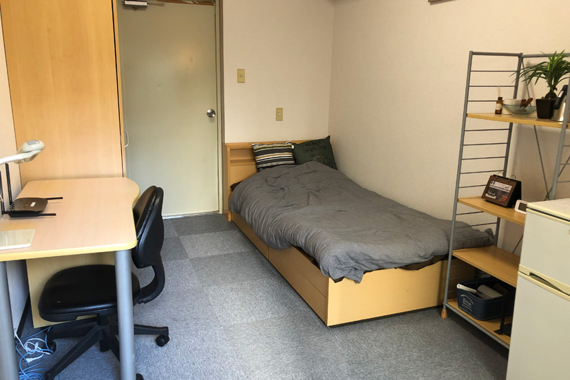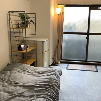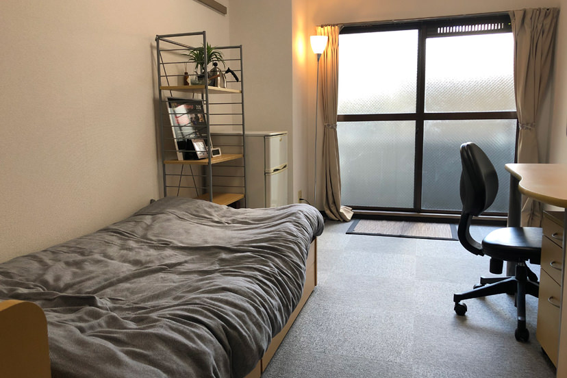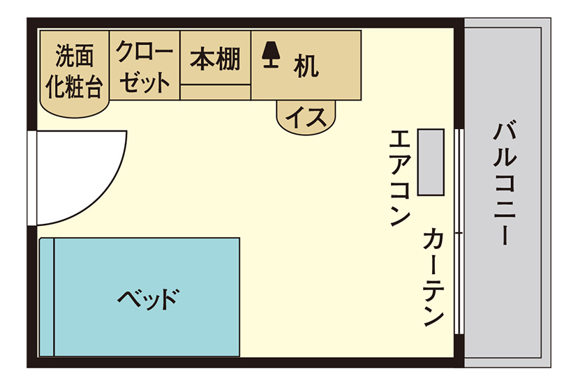 エアコン・居室Wi-Fi・ベッド(すのこ型)・デスク・椅子・照明・カーテン・タンス(クローゼット)・本棚(ラック)・ベランダ・TV端子・洗面化粧台