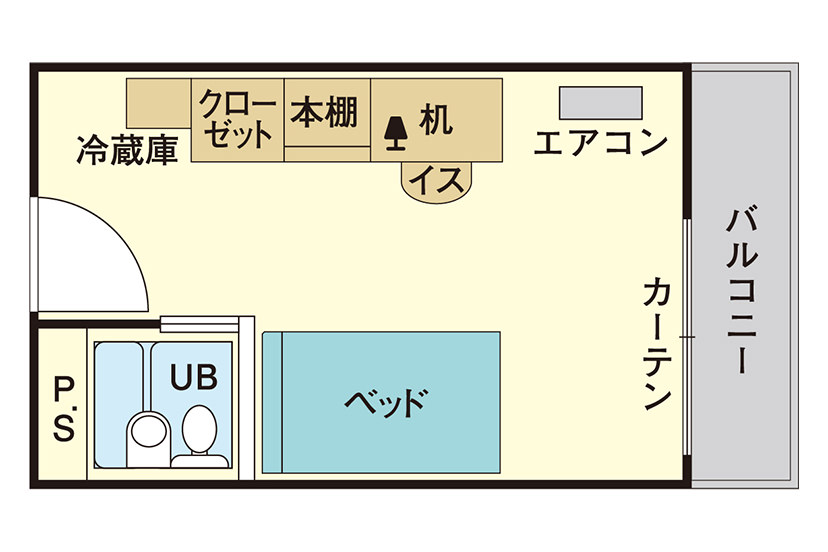 エアコン・居室Wi-Fi・ベッド(すのこ型)・デスク・椅子・照明・カーテン・タンス(クローゼット)・書棚(ラック)・2ドア冷蔵庫・ユニットバス(バス・トイレ一体型)・TV端子