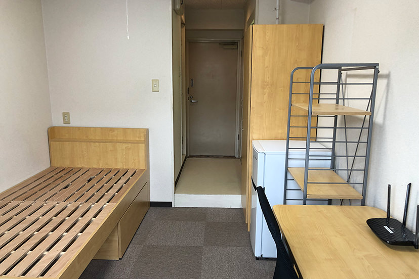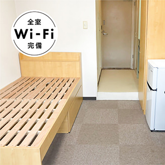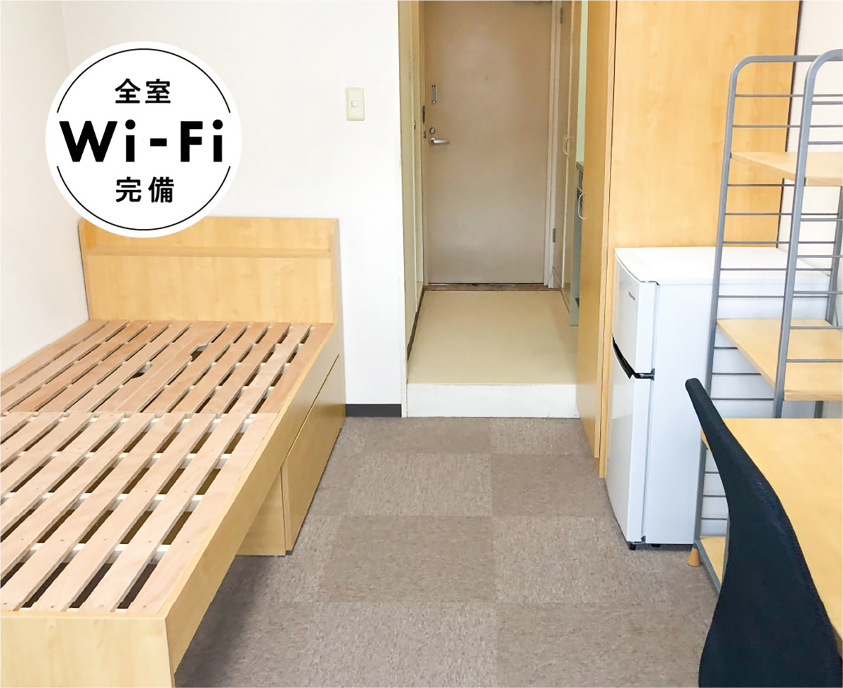 エアコン・居室Wi-Fi・ベッド(すのこ型)・デスク・椅子・照明・カーテン・クローゼット・書棚(ラック)・2ドア冷蔵庫・ユニットバス(バス・トイレ一体)・TV端子