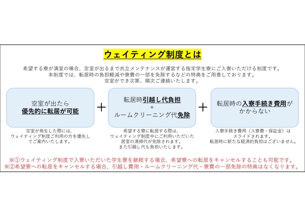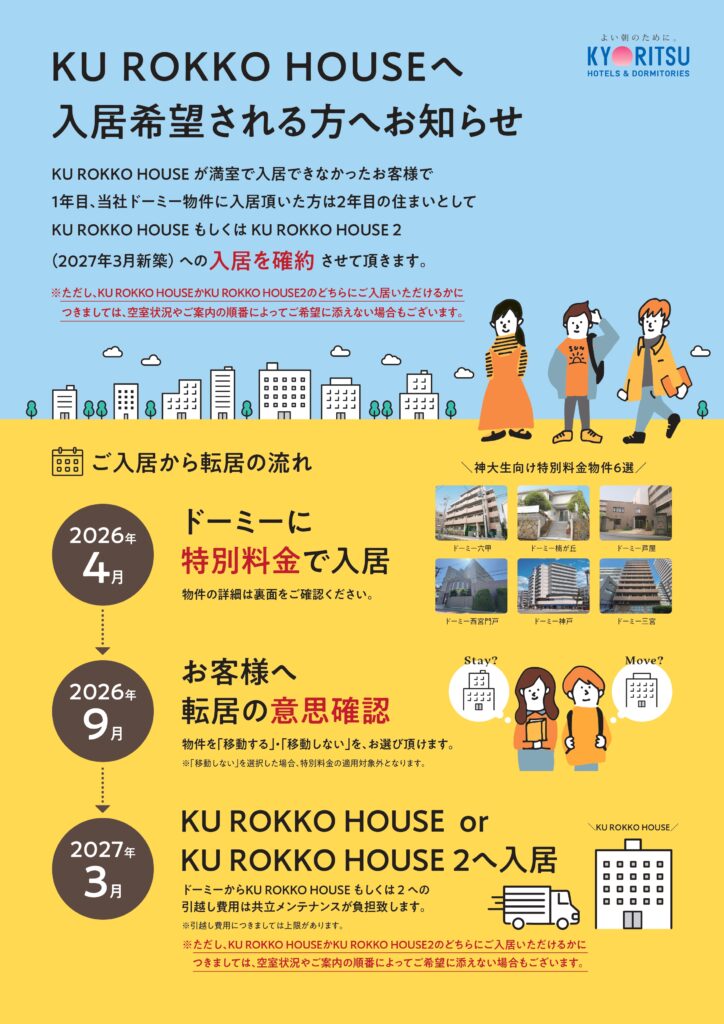 「ウェイティング制度」とは、KU ROKKO HOUSEが満室で入居できない場合に、代替物件にご入居いただき、2年目にKU ROKKO HOUSEかKU ROKKO HOUSEⅡのいずれかへ住み替えができる制度です。(※どちらの寮に住み替えいただけるかにつきましては、空室状況やご案内の順番によってご希望に添えない場合もございます。)