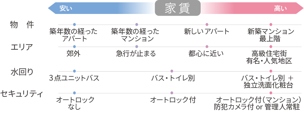 アパートやマンションは、エリアや設備、築年数などによって家賃が変わります。ワンルーム物件の家賃の高低の目安を掲載しましたので、参考にしてください。