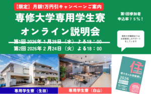 専修大学専用学生寮(生田・白山)のオンライン説明会を実施致します。