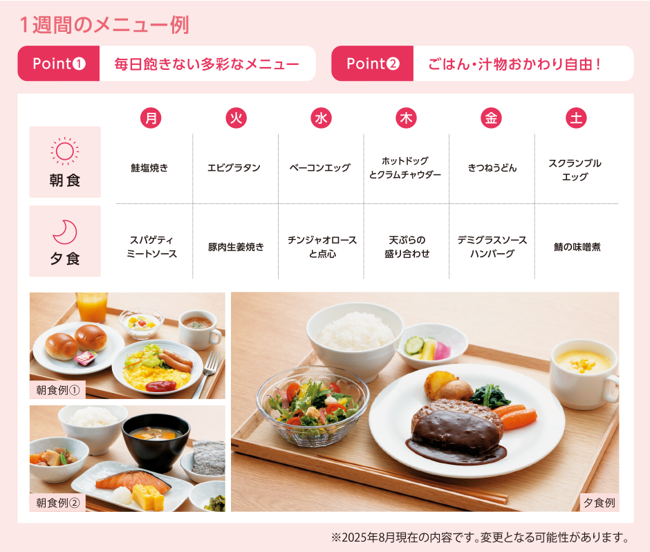 健康的な生活を送っていただくために、朝・夕ともにきちんと計算されています。 |