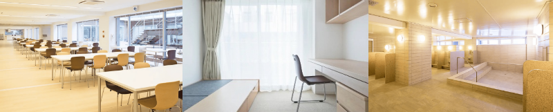 寮内の施設には広々としたダイニングルームをはじめ音楽練習ルームやトレーニングルーム、大浴場やプライベートシャワーブースといった共用施設が備わっています。