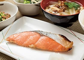 ごはん、味噌汁、鮭塩焼き、小鉢、おしんこ、納豆、海苔