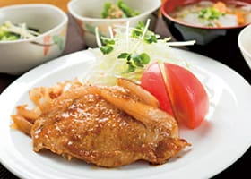 ごはん、生姜焼き、おひたし、小鉢、味噌汁、香物