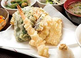 ごはん、天ぷら、酢物、なめこ汁、小鉢、おしんこ、フルーツ