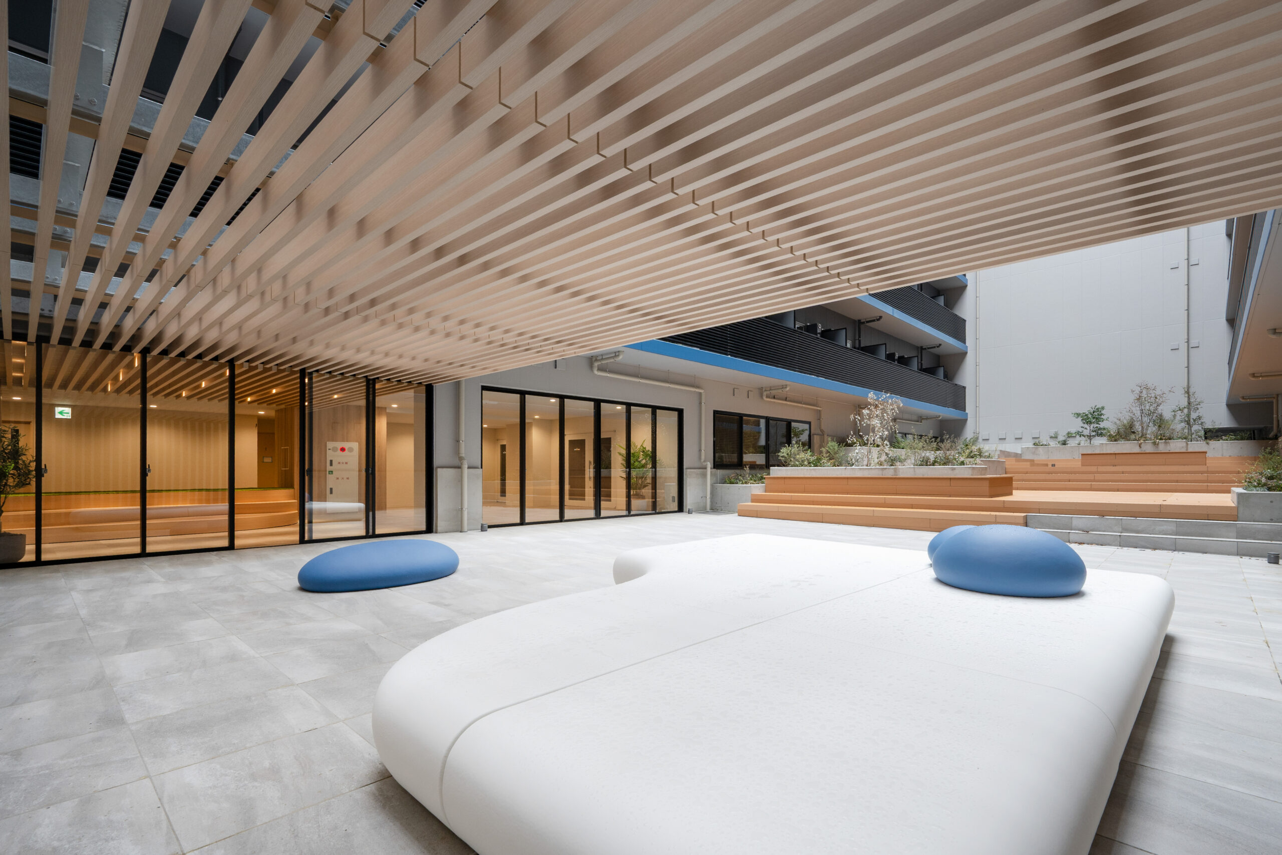 建物の合間に広がる開放的な空間で、自然と人が集まり語らう場所